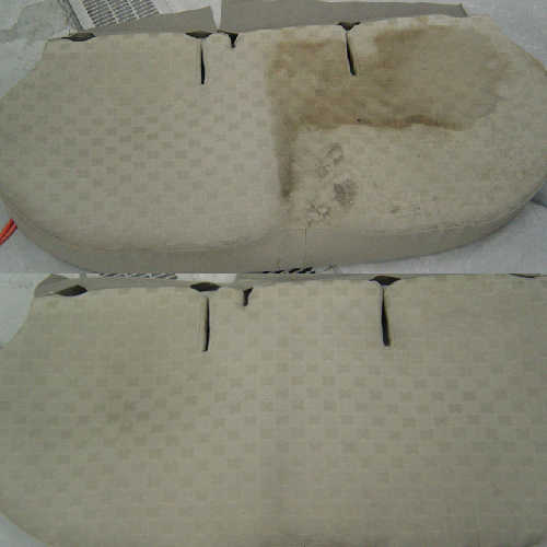 車のシートは結構汚れていて、このように目に見えるシミやごみの他、見えないダニやホコリも意外についているものです。シート掃除に使う洗剤は弱アルカリ性。人にも環境にも優しい洗剤を使っています。特にお子様がいらっしゃる方はおススメします。